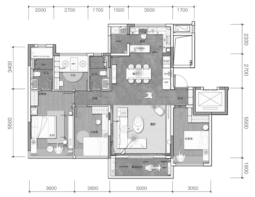 约5.5米+约3.4米的进深 ,突破传统主卧中“双人床+大衣柜”的单一设计,集起居、衣帽、 主卫 、自由四大功能于一体, 夫妻二人关上门就是一个独立的生活状态,可以各自学习、妆扮,互不干扰,通过 “主卧小家化“来实现对于个人空间及夫妻空间的需求。