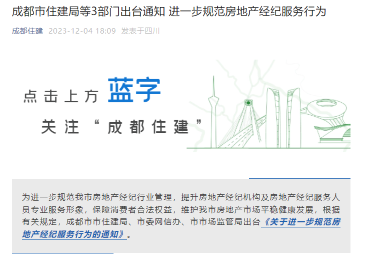 近日,成都市市住建局、市委网信办、市市场监管局等三部门,联合重磅发声,出台《关于进一步规范房地产经纪服务行为的通知》。