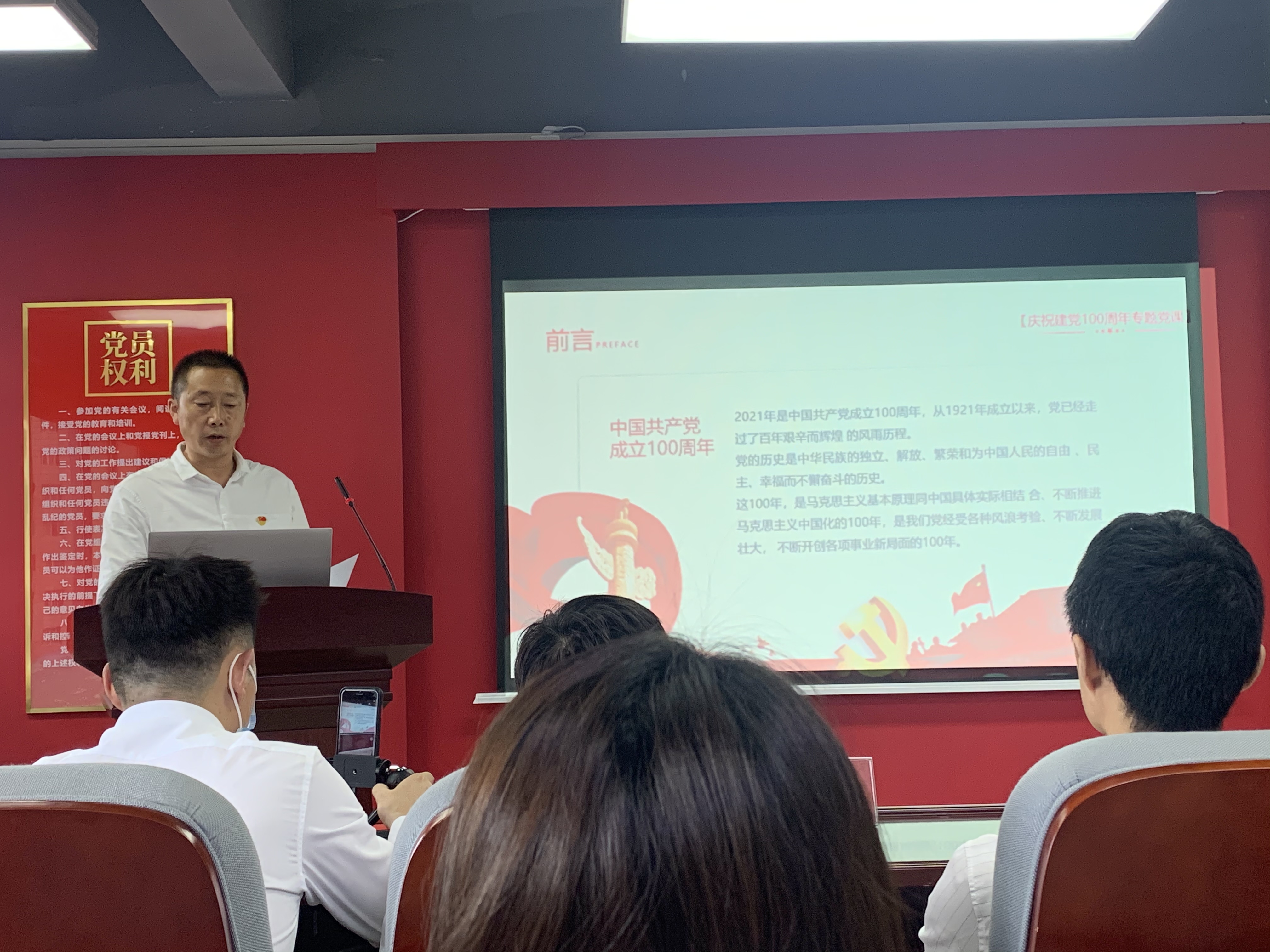 党组织书记党课学习,让大家更加深入认识到到党的进程,传承党的精神,使我们在工作中更加大放异彩。重温入党誓词,“我志愿加入中国共产党,拥护党的纲领,遵守党的章程……”坚定铿锵的誓言响彻会场,久久激荡在每一位员工心头。