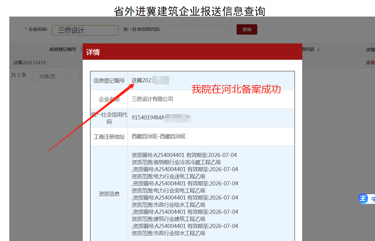 在2021年7月19日,在河北的备案传来了好消息:河北省政务网查询结果显示河北省住建厅已经发布了三桥设计院的备案公告,意味着本院在河北备案成功!