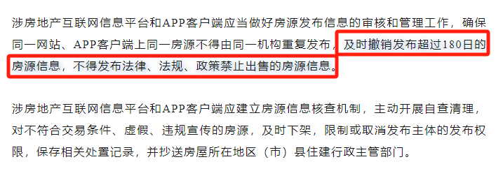 其中,最让我们关注的,还是:要求强化房源发布信息的审核和管理工作,撤销发布超过180日的房源信息,且要求房地产互联网信息平台和APP客户端主动开展自查清理。