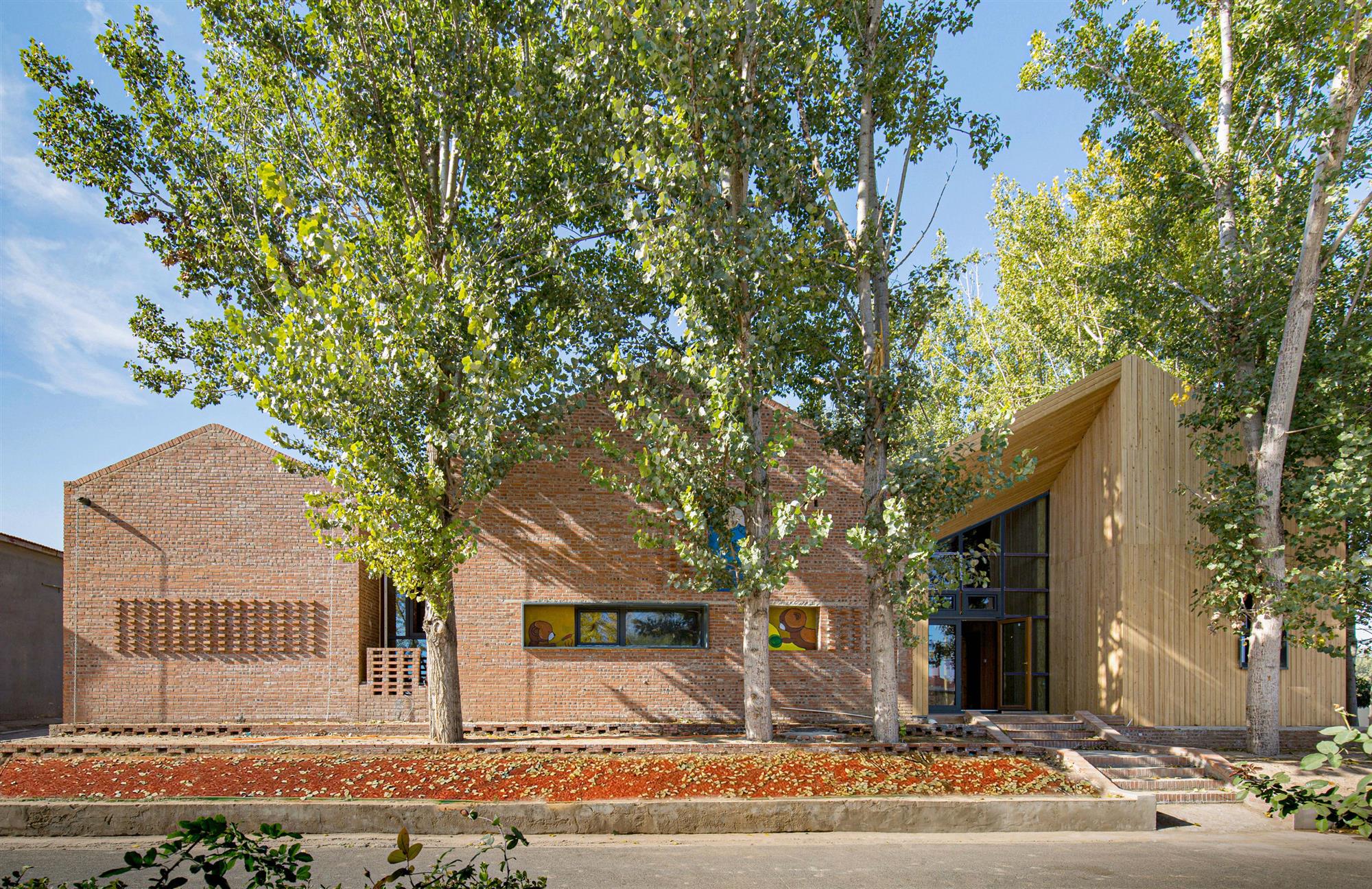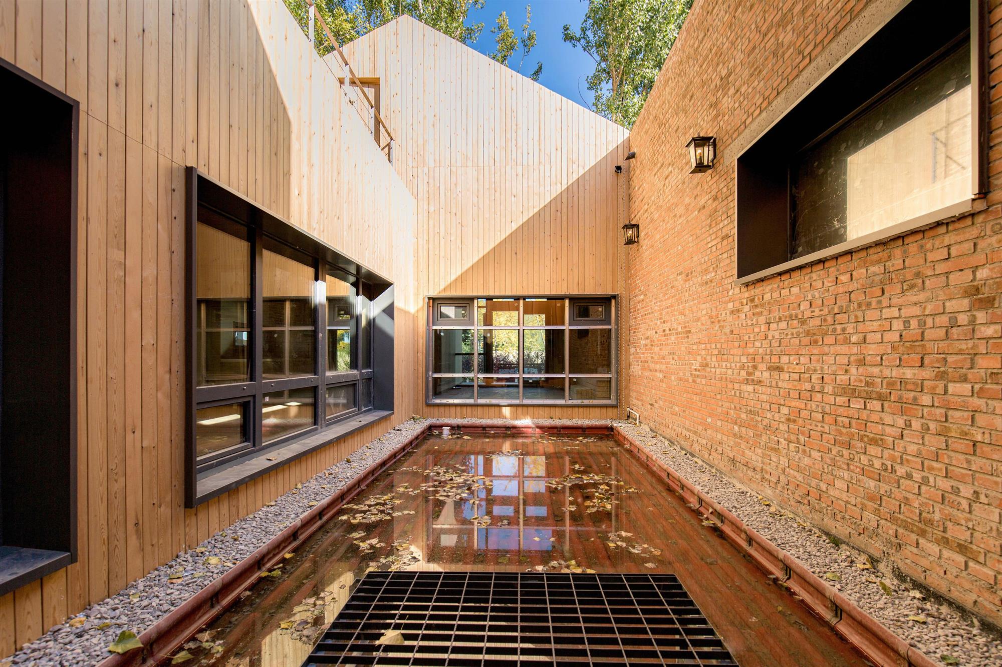 大面积的天窗和风塔为室内采光与通风提供了充足的补给,创造了冬暖夏凉的人居环境,郁郁葱葱的杨树透过天窗向室内洒下斑驳的倒影,建筑与自然自成画卷。