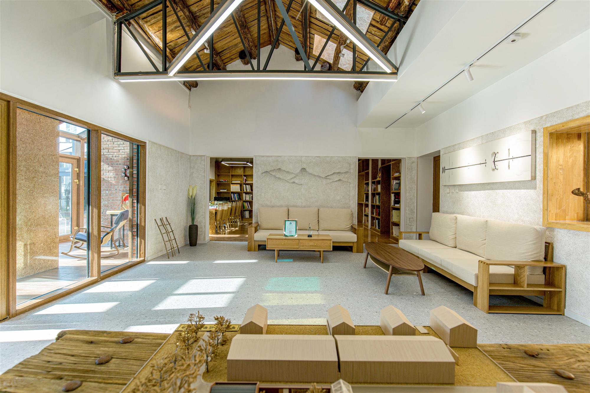 将自然景观与传统院落进行了有机结合,从花园游走至书屋,氤氲的空气与阳光浸润着每一处角落,身心得到舒展。连接着展示与办公空间,将劳与逸互相通,从而实现了空间使用的最大化利用。