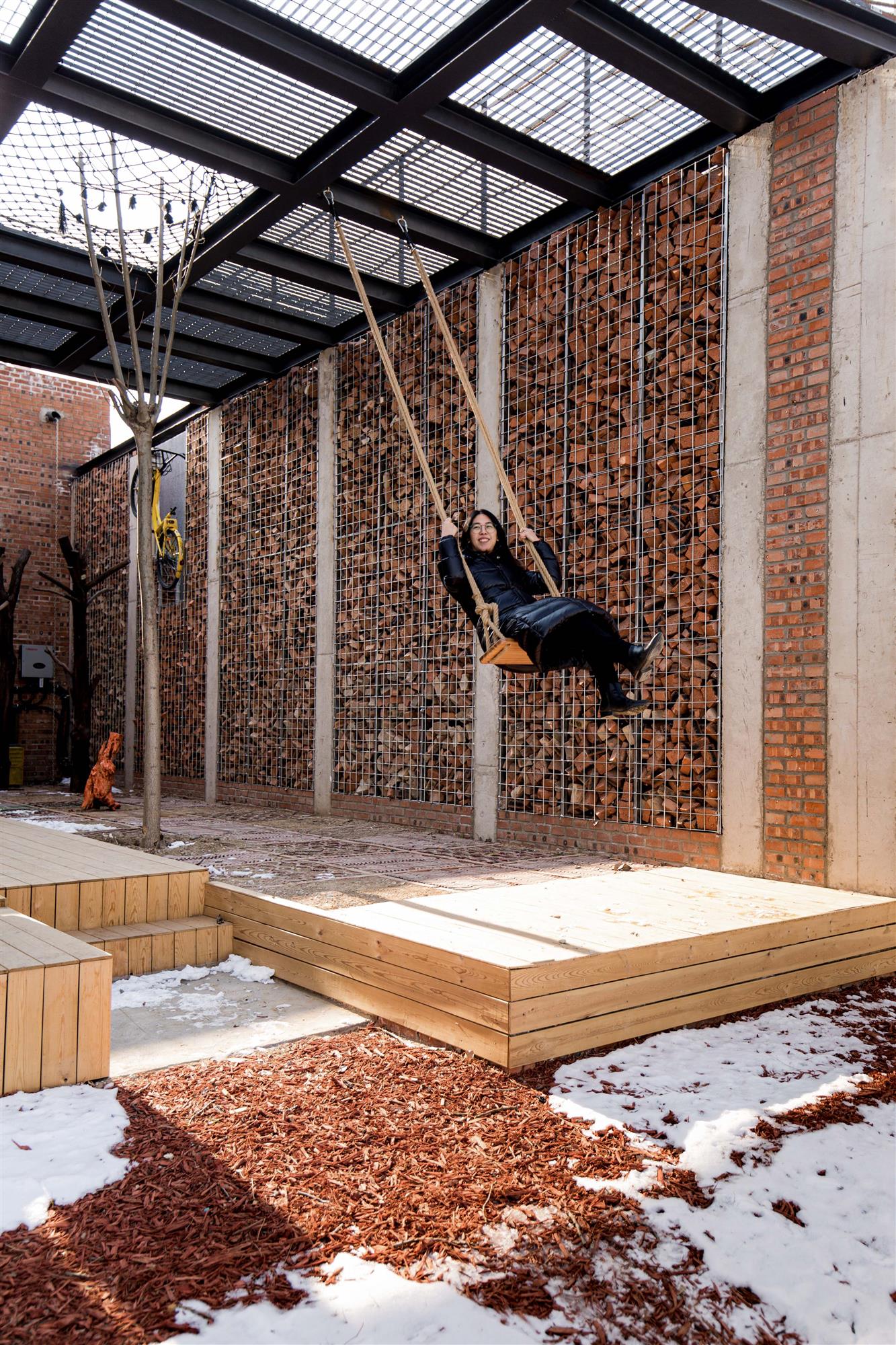 围墙上用拆除的旧窗做出了LOGO