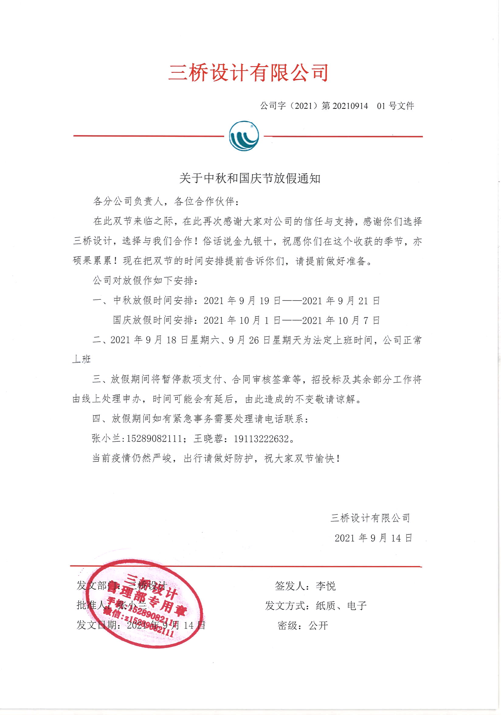 四、放假期间如有紧急事务需要处理请电话联系: